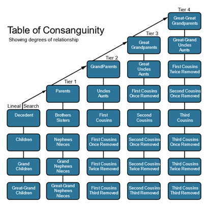 For the purposes of this section of the legislation, the “closest next of kin” is the closest blood relative to the deceased and is determined by “counting upward from the deceased to the nearest common ancestor and then downward to the relative.”[4] See the attached Table of Consanguinity.